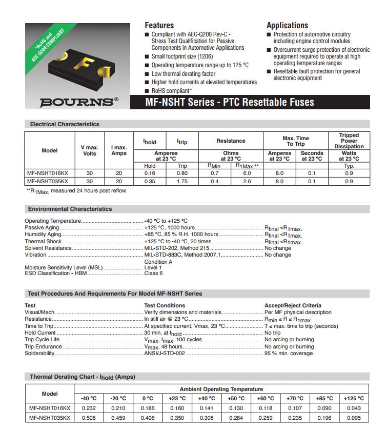 簡述: BOURNS 車規保險絲 MF-NSHT AEC-Q200認證 車規認證保險絲 車規級保險絲